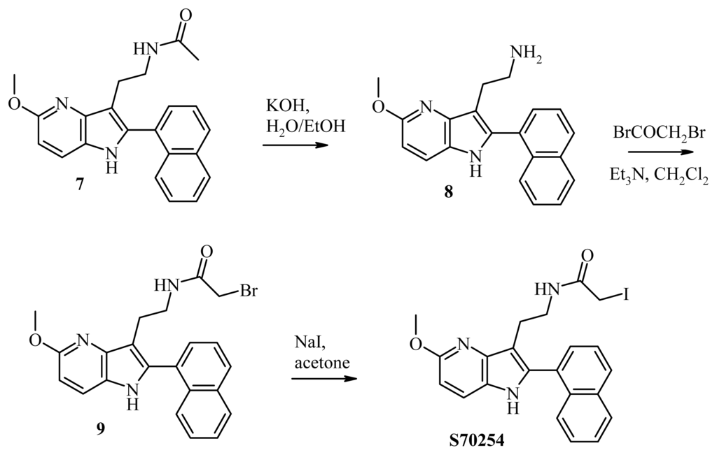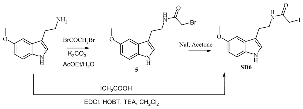 N-[2-(5-methoxy-1H-indol-3-yl)ethyl]iodoacetamide (compound SD6, Figure 5) was obtained through two routes according to the synthetic pathway illustrated in Figure 5: