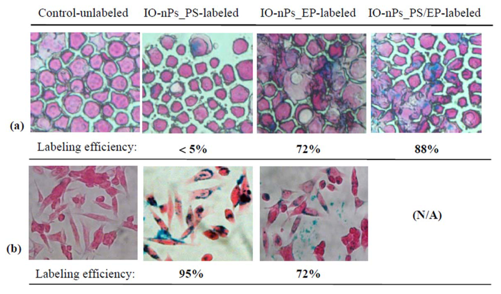 Cell labelling by electroporation and PS/electroporation: (a) stained promptly after electroporation (Cytospin staining); (b) stained after overnight culture. PS, protamine sulphate; EP, electroporation; IO-nPs, ferumoxides.