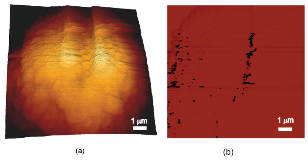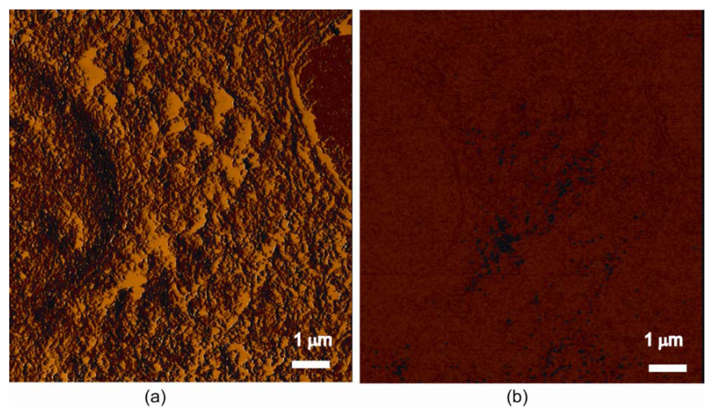 MFM images of a single cell: (a) 3D morphological image of the cell; (b) phase image in retrace mode (lift height of 100 nm from cell surface) showing SPIOs uptake and spatial distribution.