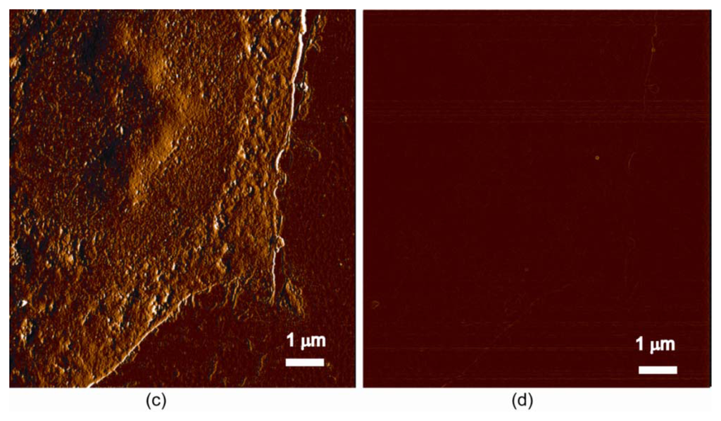 Magnetic force microscopy (MFM) images showing nanoparticles’ uptake and spatial distribution within single cells: (a–b) a labelled cell with morphological images in (a) and SPIOs uptake and a spatial distribution in phase (retrace) image (b); (c–d) an unlabelled cell for control with morphological images in (c), and no such phase shift detected in (d).