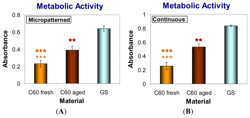Metabolic activity measured per cultures of human osteoblast-like MG-63 cells on day seven after seeding on micropatterned (A) or continuous (B) fresh and aged fullerene films. GS, microscopic glass coverslips, reference material; * significant difference to GS; + significant difference to C60 aged. p ≤ 0.001 (***/+++); p ≤ 0.01 (**/++).