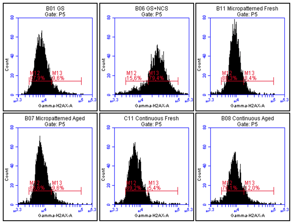 Flow cytometry of a marker of DNA damage response: gamma-H2AX in human osteoblast-like U-2 OS cells on micropatterned or continuous fresh and aged fullerene films after seven days of cultivation. GS, microscopic glass coverslips, reference material; GS + NCS, positive control to phosphorylation of histone H2AX (gamma-H2AX), induced by 1 h incubation of U-2 OS cells in neocarzinostatin (NCS; 700 ng/mL). M12 defines the percentage of cells with no increase of DNA damage (obtained from cells growing on reference material, GS); M13 defines the percentage of cells with increased DNA damage response represented by enhanced phosphorylation of histone H2AX (obtained from cells incubated with NCS).