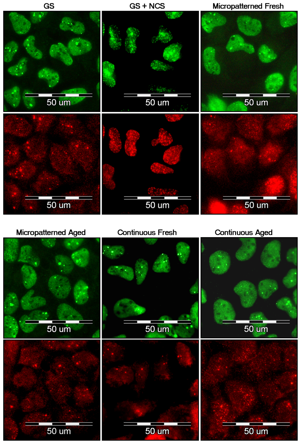 Immunofluorescence staining of markers of DNA damage response: 53BP1 (green) and gamma-H2AX (red) in human osteoblast-like U-2 OS cells on micropatterned or continuous fresh and aged fullerene films after seven days of cultivation. GS, microscopic glass coverslips, reference material; GS + NCS, positive control to DNA damage response, induced by 1 h incubation of U-2 OS cells in neocarzinostatin (NCS; 700 ng/mL).