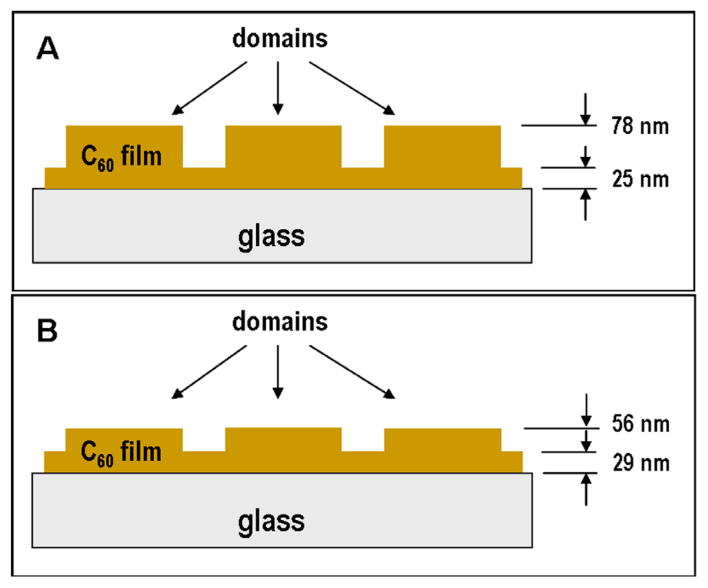 It is also possible to use AFM to scan and analyze the heights of the prominences and grooves. The measurements revealed, in the case of the fresh C60 films, that the prominences are about twice as high as the grooves (prominences = 53 nm, grooves = 25 nm), though in the case of the aged layers, the height of the C60 prominences are similar to the height of the grooves (prominences = 27 nm, grooves = 29 nm; Figure 2). This decrease in height of the prominences on aged C60 films can be explained by post-deposition surface diffusion of the fullerene molecules in time, i.e., during the aging period of fullerene films.