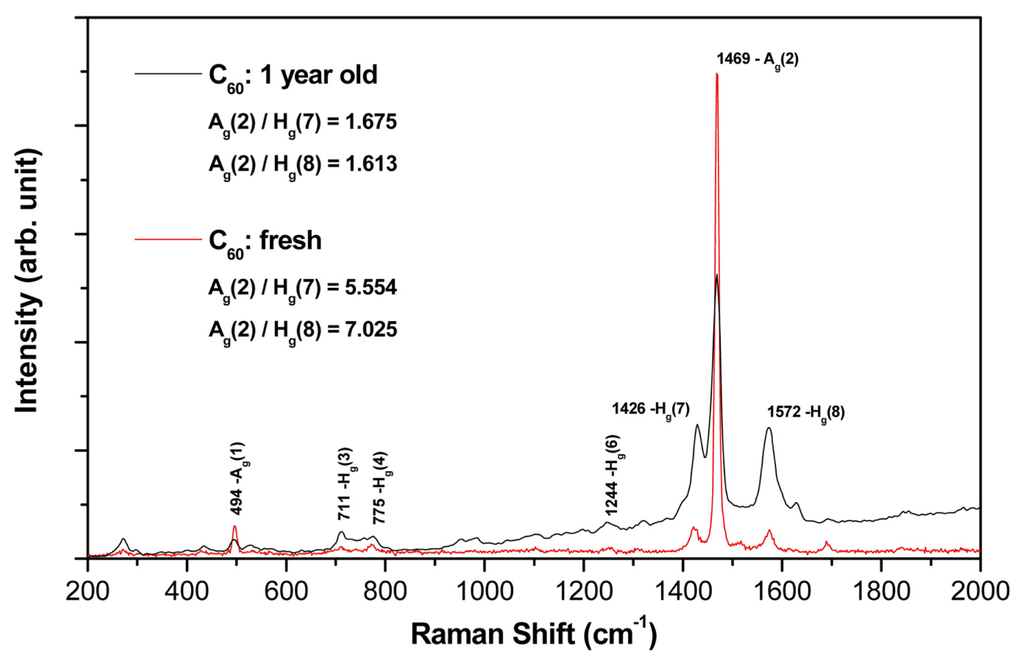 The chemical composition and bonding of the fresh (i.e., one week old) and aged (i.e., one year old) fullerene films were characterized by several techniques, including Raman spectroscopy.