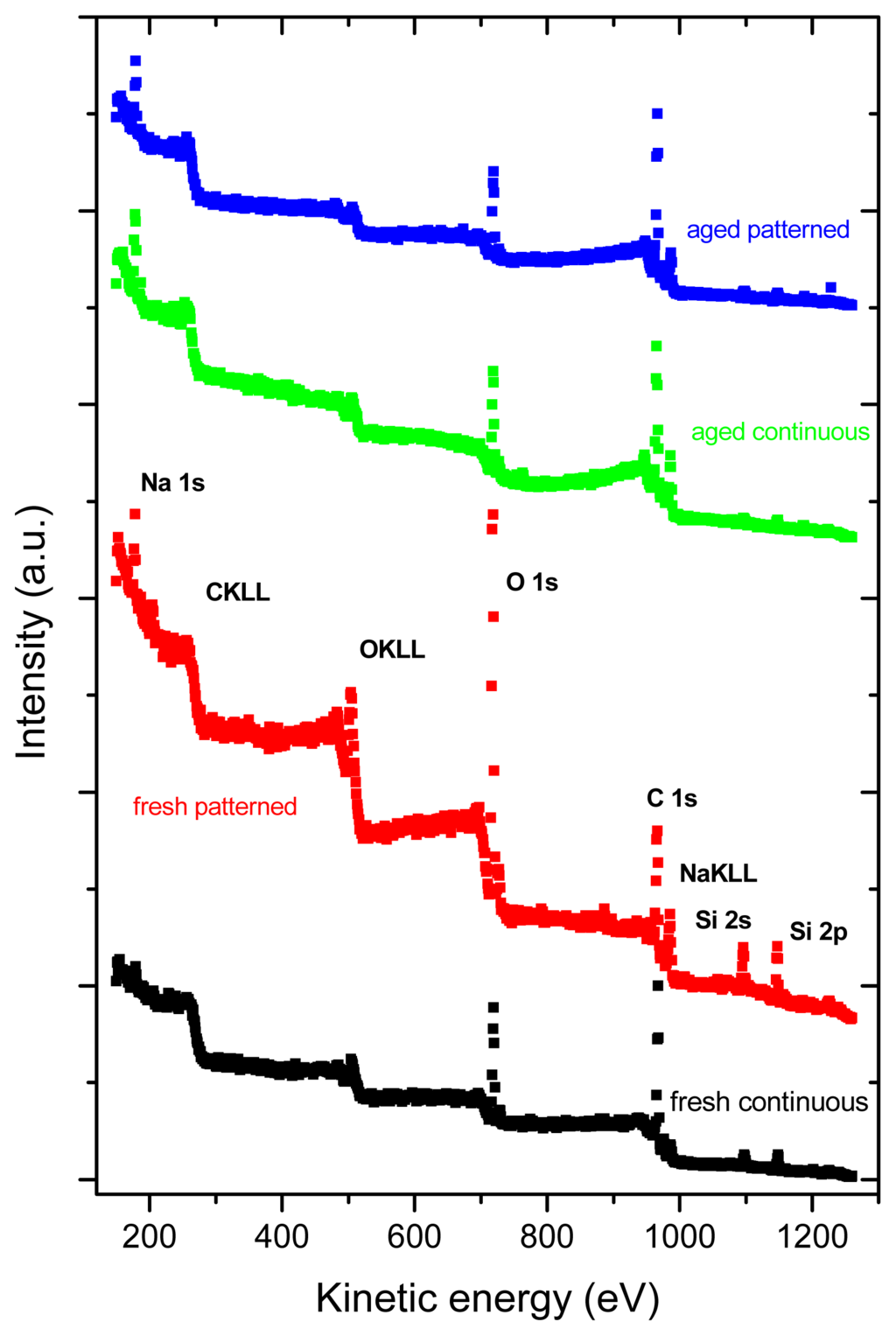 Survey XPS spectra of samples under analysis. C 1s, O 1s Si 2s, Si 2p and Na 1s are core-level photoelectron spectra from carbon, oxygen, silicon and sodium atoms. C KLL, O KLL and Na KLL are Auger transitions from carbon, oxygen and sodium atoms.