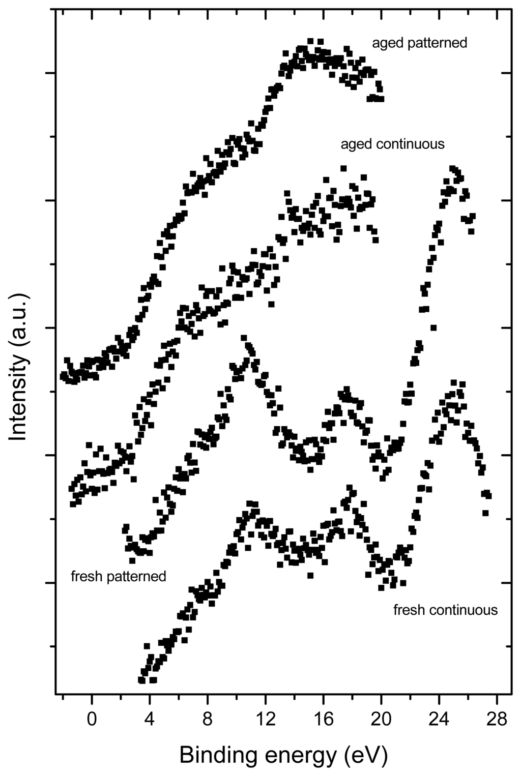 Photoemission from occupied valence bands induced by Mg Kα radiation (1253.6 eV). The spectra of fresh prepared samples show oscillations typical for fullerenes. For aged samples, the spectral features are more complex, indicating strong degradation of the fullerene molecular structure or a surface contamination by a carbon-containing species from air.