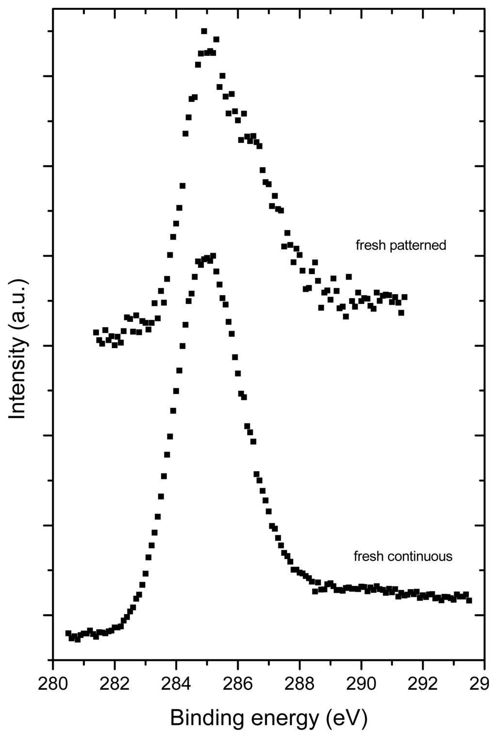 High-resolution C 1s lines recorded from fresh deposited samples. Both spectra were corrected for surface charging with respect to the Si 2p line at 103.0 eV. The shape of the bottom spectrum is similar to that of fullerene while the top spectrum is highly asymmetric due to C-O bonding states.