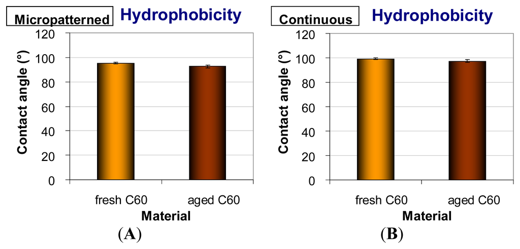 The continuous and micropatterned layers were at a relatively high hydrophobic level. The water drop contact angles of fresh materials were 95.3° on micropatterned films and 99.3° on continuous films. Similar results were obtained in our earlier studies performed on continuous and micropatterned C60 films of various thicknesses [28,29]. A slight decrease of the water contact angle was observed in the aged fullerene films (92.7° on micropatterned and 97.2° on continuous films); however, this reduction was not proven to be statistically significant (Figure 7). This tendency to increase in surface wettability could be due to the changes of the fullerene films during aging, such as their polymerization, oxidation, graphitization and degradation, as revealed by the Raman spectroscopy and XPS (Figures 3 and 5). In our earlier studies, similar changes were observed on fullerene films exposed to 70% ethanol used for material sterilization ([28]; for a review, see [14]).