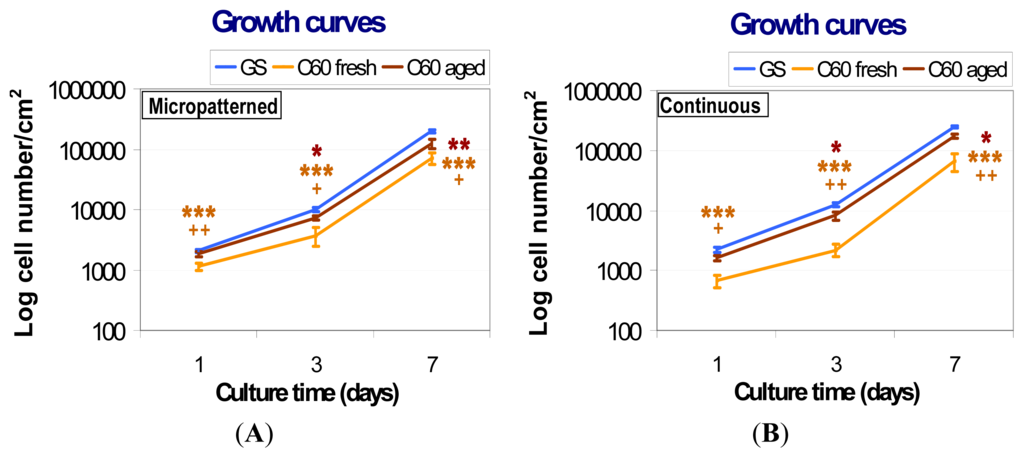 Growth curves of human osteoblast-like MG-63 cells on micropatterned (A) or continuous (B) fresh and aged fullerene films. GS, microscopic glass coverslips, reference material; * significant difference to GS; + significant difference to C60 aged. p ≤ 0.001 (***/+++); p ≤ 0.01 (**/++); p ≤ 0.05 (*/+).