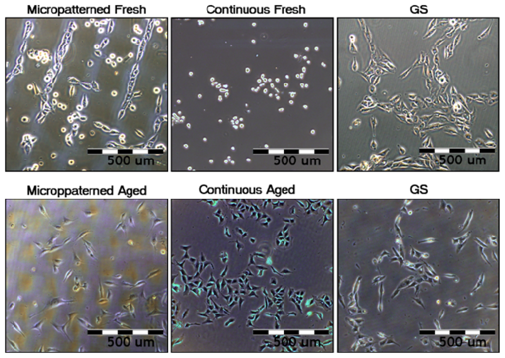 The morphology and preferential growth of human osteoblast-like MG-63 cells on micropatterned or continuous fresh and aged fullerene films on day 3 after seeding. GS, microscopic glass coverslips, reference material.