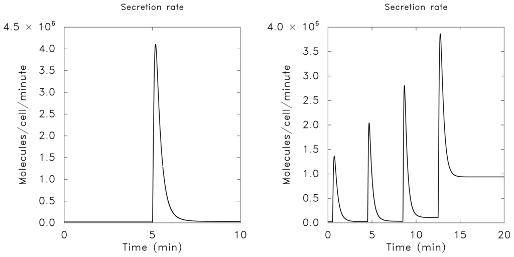 Two examples of the response of an adapting system to changes in the stimulus level. We show the predicted cyclic AMP (cAMP) relay response, as measured by the secreted cAMP, to extracellular cAMP stimuli in the cellular slime mold Dictyostelium discoideum. Left: A step change in extracellular cAMP from 0 to 10−8 M elicits a single pulse of secreted cAMP. Right: The system responds and adapts to a sequence of step increases ranging from 10−9 M to 10−6 M, but at the highest stimulus the transduction system saturates. (From [1], with permission.)
