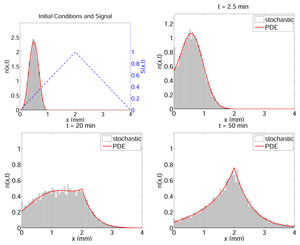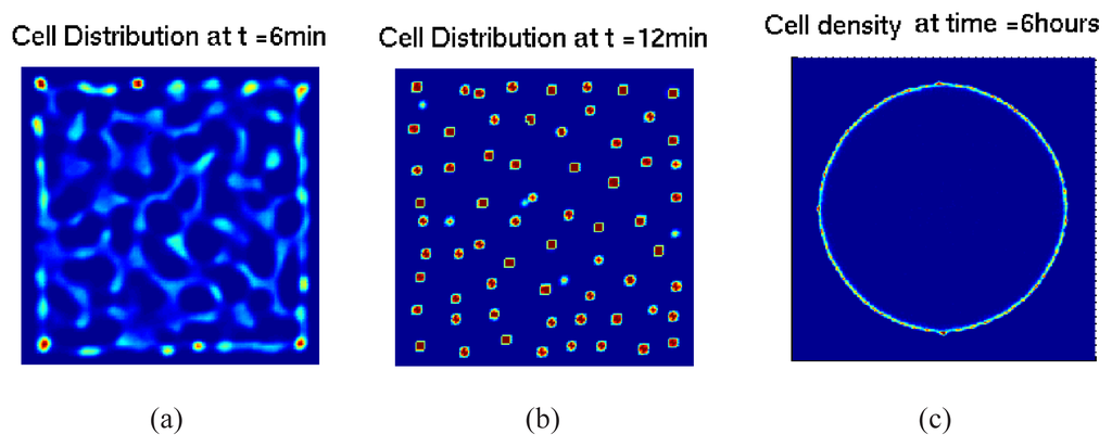 Chemotaxis of E. coli can lead to spontaneous, self-organized pattern formation. In the 1960’s it was found that a E. coli colony forms moving bands/rings when exposed to a nutrient that also serves as a chemoattractant [167]. In the 1990’s, it was shown that E. coli colonies can organize into stable spatial patterns in either a semi-solid agar or liquid medium, by responding to a self-secreted chemoattractant (aspartate and analogues) [9,146]. When grown in semi-solid agar with a single nutrient source (e.g., succinate), a droplet of E. coli grows and depletes nutrient locally, and over the following three days, a concentric swarm ring forms and spreads radially from the inoculation site. A symmetric array of spots or stripes may form sequentially in the wake of the spreading ring depending on the initial nutrient concentration [9,146]. The speed of the swarm ring is observed to be inversely proportional to the initial nutrient concentration. When grown in a liquid medium, E. coli cells secrete attractant and self-organize into network patterns initially, and the networks subsequently collapse into moving aggregates which merge over time. The timescale of patterning for the liquid suspension experiments is of the order of minutes. Mittal et al. [166] studied E. coli aggregate formation in a quasi-2D system, and showed that the size of an aggregate is about 150 ~ 200 μm in diameter and depends primarily on the adaptation time scale of the bacteria and only weakly on the total number of cells. Recently, E. coli traveling pulse patterns have also been observed in more complicated nutrients [168,169]. Due to the complicated nature of the nutrient, the exact chemical signal that leads to these patterns is not known, although the mechanism is believed to be similar to Budrene-Berg experiments. The adoption of the recent microfluidic techniques, allows precise tracking of individual trajectories of cells and analyze their movement in great detail. In [169], it is found that not only the mean run length of cells but also the directional persistence are larger in the direction of wave propagation. By incorporating these asymmetries of cell movement to a kinetic model similar to the hybrid cell-based model discussed later, these authors matched numerical simulations to experimental data seamlessly.