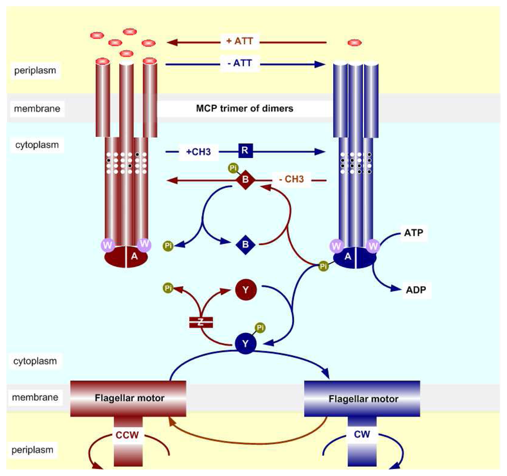 A schematic of the signal transduction pathway in E. coli. The trimer of chemoreceptor homodimers spans the cytoplasmic membrane, with a ligand-binding domain on the periplasmic side and a signaling domain on the cytoplasmic side. The cytoplasmic signaling proteins, denoted Che in the text, are identified by single letters, e.g., A = CheA. Proteins and reactions in red promote counterclockwise (CCW) rotation of flagella, and those in blue promote clockwise (CW) rotation of flagella. Receptor methylation sites involved in adaptation are shown as white (demethylated) and black (methylated) circles.