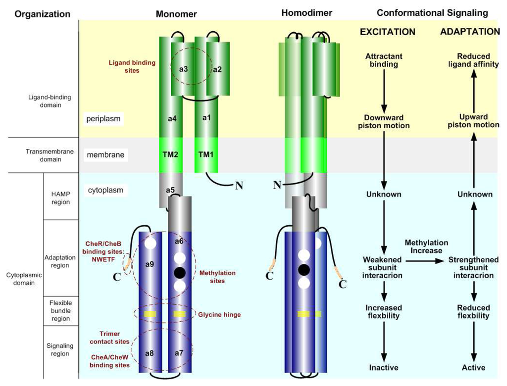 The structure of chemoreceptors. The schematic view of a chemoreceptor monomer (left) demonstrates the primary architecture consisting of ligand-binding domain (α1–α4), transmembrane domain (TM1–TM2), and cytoplasmic domain (α5–α9). The cytoplasmic domain can be further divided into four functional subdomains: the HAMP region, the adaptation region, the flexible bundle region, and the signaling region. The schematic view of a chemoreceptor homodimer (middle) illustrates the spatial organization, and the conformational changes of the homodimer involved in the excitation and adaptation phases are shown in the flowchart (right), summarized from [30].