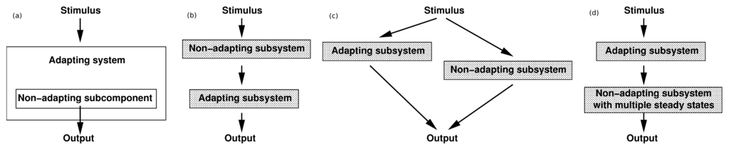 Examples of various adapting and non-adapting systems. (a) A signal transduction pathway in which a specified upstream quantity adapts, but the output species further downstream does not, because the output depends on a non-adapting subcomponent of the upstream adapting quantity; (b) Similar to that in (a), except that here the upstream quantity does not adapt, but the subcomponent adapts, and so the output species adapts as well. We will see later that one may think of the adapting subcomponent as the sum of the states of the receptor containing phosphorylated CheA, and the upstream non-adapting quantity as some other function involving the various phosphorylated and unphosphorylated states; (c) An example of a signal transduction pathway in which a specified upstream quantity adapts, but the output species further downstream does not, because the output depends on both the adapting quantity and another non-adapting quantity; (d) An example of a signal transduction pathway in which a specified upstream quantity adapts, but the output specified further downstream does not because it depends on an intermediate subsystem which possesses more than one stable steady state. Transient changes in the upstream quantity may cause the intermediate subsystem to reach a steady state different from its prestimulus state.