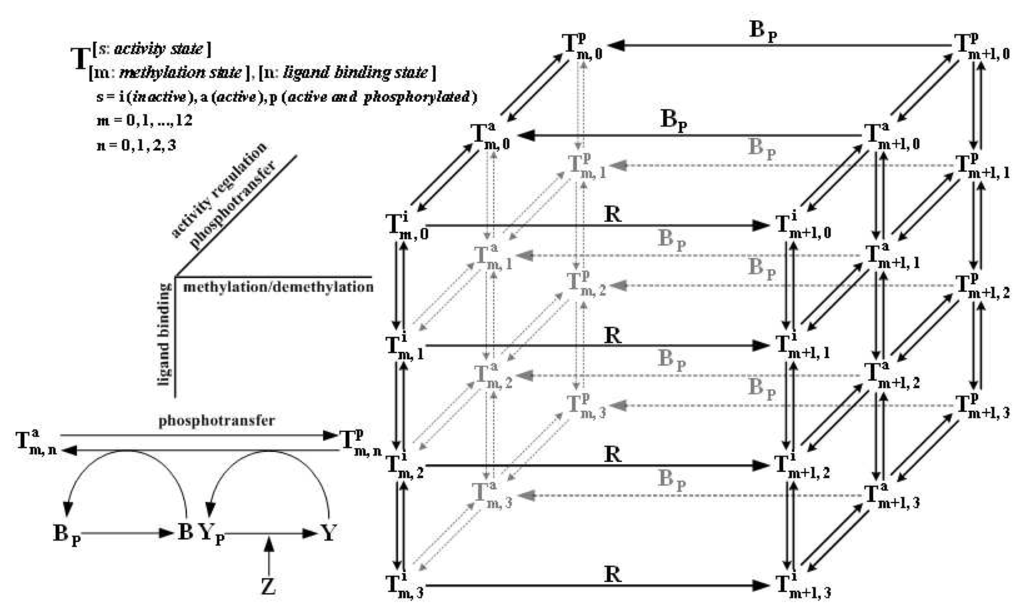 Signal transduction network. The basic unit of the network is the signaling complex, denoted by T. The three indices used to denote the properties of the complex are shown in the upper left corner. In the reaction network, vertical transitions are ligand binding and release, horizontal transitions are methylation and demethylation, and front-to-rear and reverse transitions are kinase activation, deactivation, phosphorylation and dephosphorylation. The details of the phosphotransfer transitions are depicted at the left. Adopted with permission from [143].
