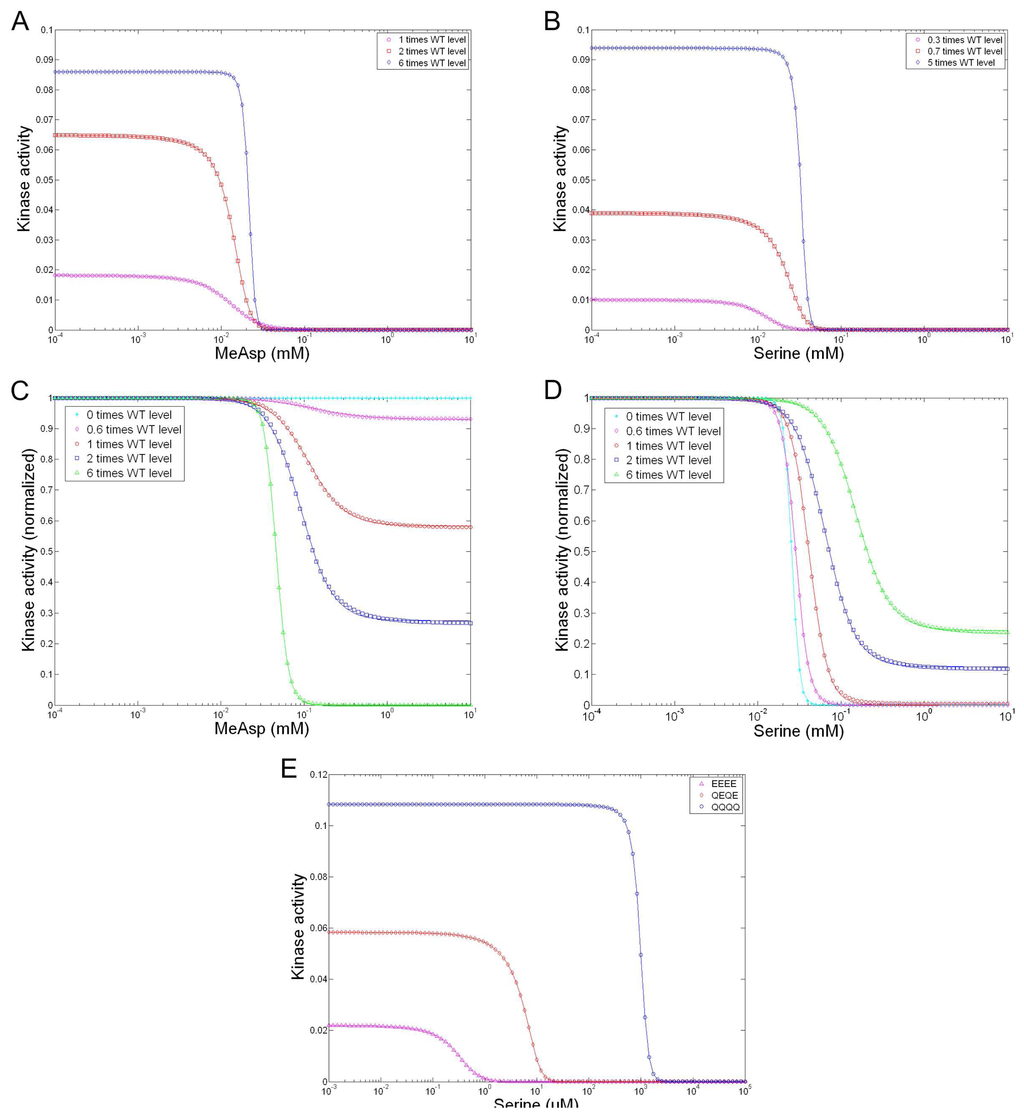 We use this model to explain the observed ultrahigh cooperativity. We simulate the responses to methyl-aspartate (MeAsp) and serine in the cheRcheB mutants with different expression levels of the receptors Tar and Tsr and compare to Sourjik and Berg’s experiments. In Figure 7(A) are shown the responses to MeAsp in the cheRcheB mutants with only Tar expressed (compare to Figure 2(a) in [39]), in Figure 7(B) are the responses to serine with only Tsr expressed (compare to Figure 2(b) in [39]), in Figure 7(C) are the responses to MeAsp with native-level Tsr and varied-level Tar expressed (compare to Figure 1(c) in [39]), and in Figure 7(D) are shown the responses to serine with native-level Tar and varied-level Tsr expressed (compare to Figure 1(d) in [39]). We also simulate the kinase activity responses of Tsr to serine in vitro, shown in Figure 7(E) and compare to Li and Weis’ experiments (Figure 3 in [67]). Data fitting with the Hill function shows that the simulation results have quantitative agreement with the measures. The details of the simulations, such as parameter values and data fitting, are omitted here but documented in [145]. Our modeling on a single trimer of dimers and extension to a cluster of trimer of dimers indicates that the strongly-coupled trimer of dimers is the core unit for signaling function, that the short-range interaction between dimer members of a trimer, which we call the intratrimer interaction, plays a key role, and that the long-range interaction between trimers in a loosely coupled cluster, which we call the intertrimer interaction, is responsible for ultrahigh cooperativity.