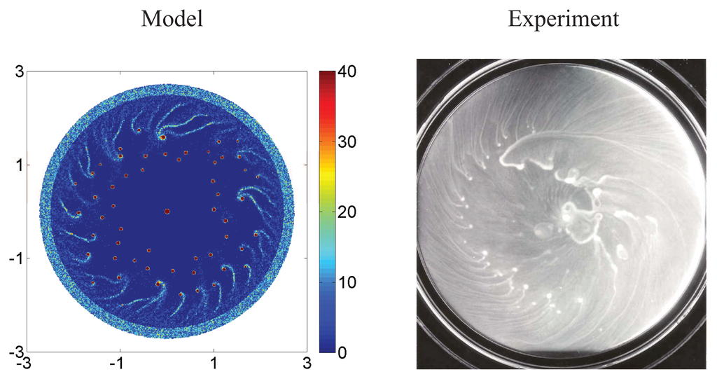The enteric bacterium P. mirabilis, which is a pathogen that forms biofilms in vivo and has a similar chemotactic system to E. coli, can swarm over hard surfaces and form a variety of spatial patterns in colonies. It has been shown that P. mirabilis colonies, when grown on hard surfaces, can grow and expand, and form radial and spiral stream patterns in the center of the colony [170]. Remarkably, the spiral streams always wind counterclockwise in repeated experiments. Xue et al. [170] showed that assuming that cell secrete a chemoattractant, the formation of streams can be explained as a result of the instability induced by local production of attractant by cells, and the spiral rotation of the population results from the fact that cells swim with a rightward bias when moving close to a surface [171,172].