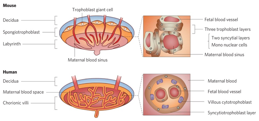 - Malassine, A.; Frendo, J.L.; Evain-Brion, D. A comparison of placental development and endocrine functions between the human and mouse model. Hum. Reprod. Update 2003, 9, 531–539. [Google Scholar]