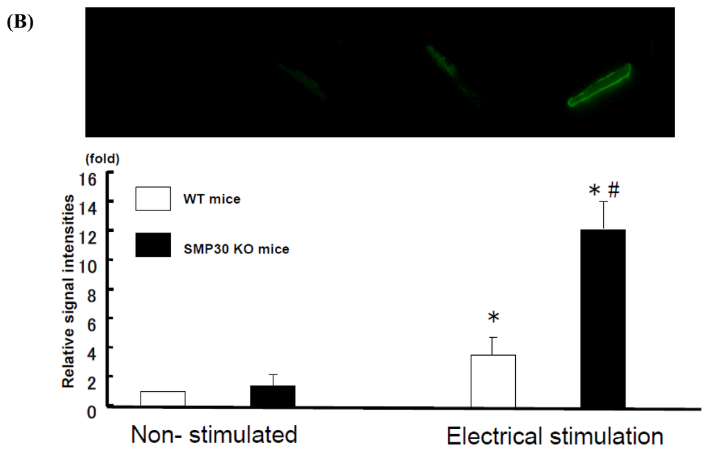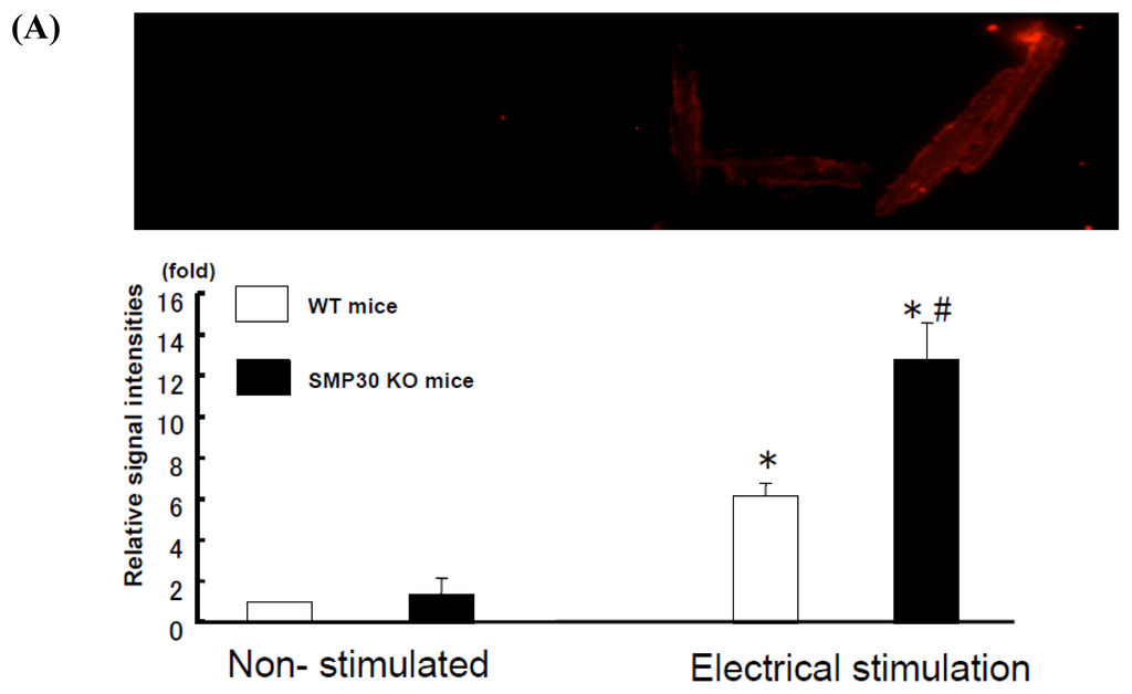 - Son, G.; Kim, S.J.; Kim, K.; Kim, M.S.; Chung, H.Y.; Lee, J. Cytoprotective roles of senescence marker protein 30 against intracellular calcium elevation and oxidative stress. Arch. Pharm. Res 2008, 31, 872–877. [Google Scholar]