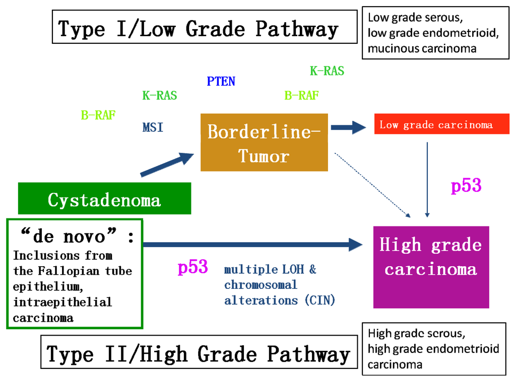 Recent studies have led to a new model of explanation for OC carcinogenesis (Figure 1). This dualistic model divides epithelial OC into two categories: Type I comprises low-grade serous, low-grade endometrioid, clear cell and mucinous carcinomas and Brenner tumors. They mostly present at stage I (tumor is confined to the ovaries) and feature certain mutations, for example K-Ras, B-Raf or PTEN. The tumorigenic pathway in type I carcinomas is characterized by the development through atypically proliferating or borderline tumors which can be considered as an adenoma-carcinoma sequence. The residues of the benign and/or the borderline stages are frequently found in association with the carcinoma. Type I tumors develop slowly over a longer period of time, are not associated with dramatic clinical symptoms and usually are detected by chance during routine examination. They show a favorable prognosis even at higher stages. Progression into type II carcinomas seems to occur only in a small subset of type I carcinomas, in particular low grade serous and endometrioid carcinomas. Apart from mutations of K-Ras, B-Raf and PTEN, type I carcinomas also feature microsatellite instability in about 15%. p53 mutations are rarely present in type I carcinomas but may occur during progression into type II carcinomas.