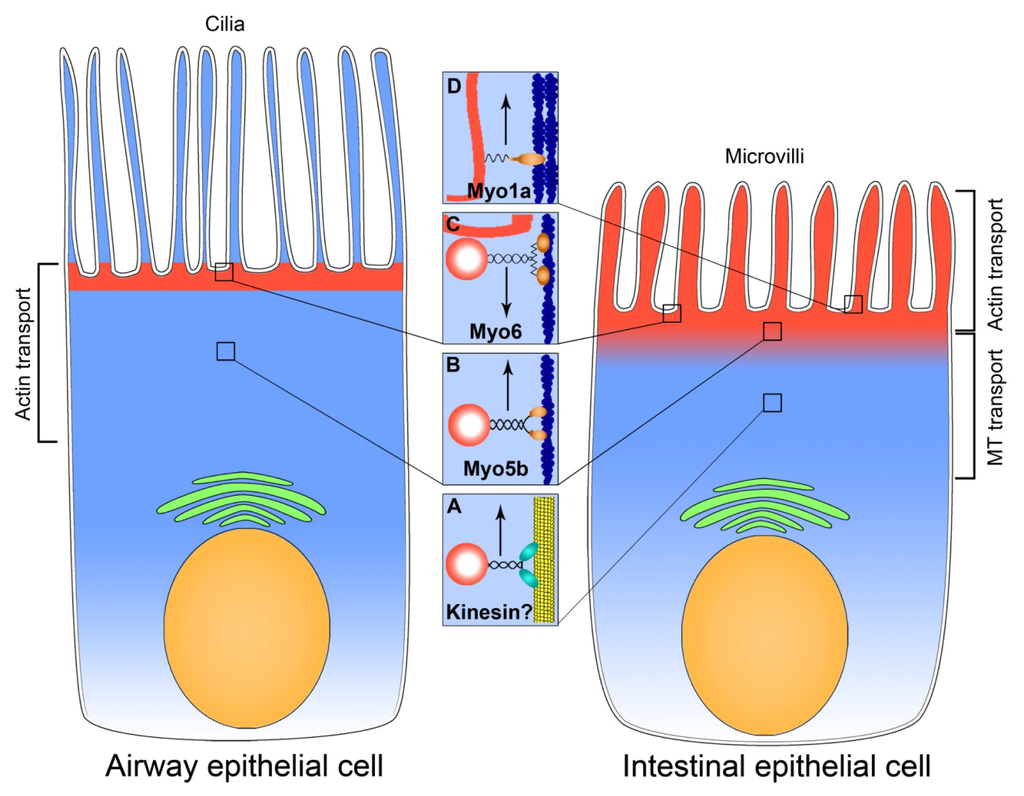 Motor transport systems involved in CFTR exocytosis in the airway and intestinal epithelium. CFTR (red) is localized to the apical domain of airway and intestinal epithelial cells. In airway epithelium, CFTR decorates the apical plasma membrane in the inter-ciliary space and subapical region, while in the intestinal epithelium CFTR is in the subapical cytoplasm, intermicrovillar and microvillar membranes. Brackets show the predominant type of transport associated with the apical delivery of CFTR. Nuclei are shown in beige, cytosol in light blue and Golgi apparatus in green. The insets A–D indicate the motors that move CFTR in the particular region of the cells, highlighted with squares. (A) MT-associated motor kinesin moves CFTR-associated vesicle up the microtubule in the intestinal epithelial cell; (B) Myo5b moves exocytic CFTR-associated vesicle on microfilaments in airway and intestinal epithelial cells; (C) Myo6 facilitates endocytosis of CFTR in airway and intestine; (D) Myo1a is important for the exocytosis and, probably, tethering of microvillar membrane-inserted CFTR in the enterocyte. Microtubule is shown in yellow, microfilaments in dark blue and PM-inserted CFTR in red. Upward arrows facing indicate exocytosis, downward arrow–endocytosis.