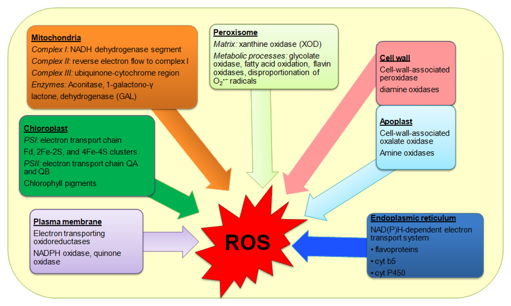 Sites of production of reactive oxygen species in plants [5].