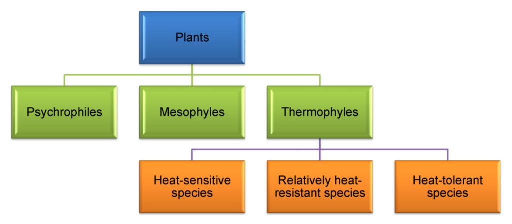 Living organisms can be classified into three groups, subject to the preferred temperature of growth (Figure 3). There are (a) Psychrophiles: which grow optimally at low temperature ranges between 0 and 10 °C; (b) Mesophyles: which favor moderate temperature and grow well between 10 and 30 °C; and (c) Thermophyles: which grow well between 30 and 65 °C or even higher [106]. There is a great variation among the plant species in terms of their response and tolerance to HT. On the basis of thermotolerance, Larcher [107] classified all the plant species into three groups (Figure 3).