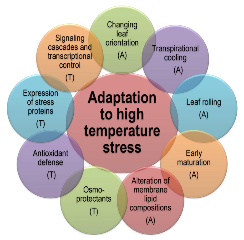 Different adaptation mechanisms of plants to high temperature. A: Avoidance, T: Tolerance.