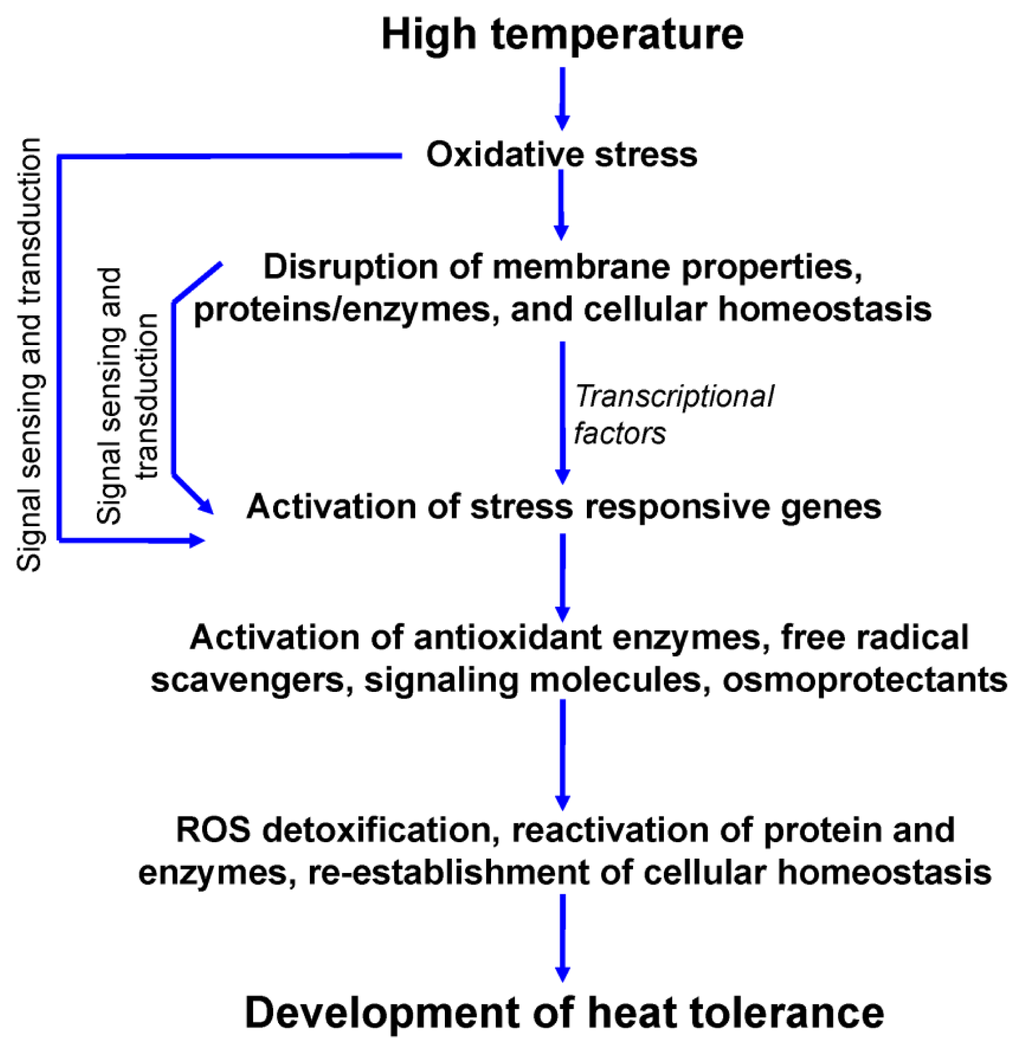 Schematic illustration of heat induced signal transduction mechanism and development of heat tolerance in plants.
