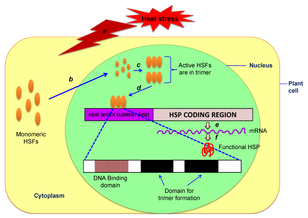 Schematic diagram showing the molecular regulatory mechanism of heat shock proteins based on a hypothetical cellular model. Upon heat stress perceived by the plant cell, (a) monomeric heat shock factors (HSFs) are entering into the nucleus; (b) from the cytoplasm. In the nucleus, HSF monomers are form active trimer; (c) that will bind; (d) to the specific genomic region (promoter or heat shock element, HSE) of the respective heat shock gene (HSG). Molecular dissection of the HSF binding region of HSE showing that it is consists of one DNA binding domain and two domains for trimerization of HSFs. Successful transcription (e) translation and post-translational modification; (f) lead to produce functional HSP to protect the plant cell and responsible for heat stress tolerance.
