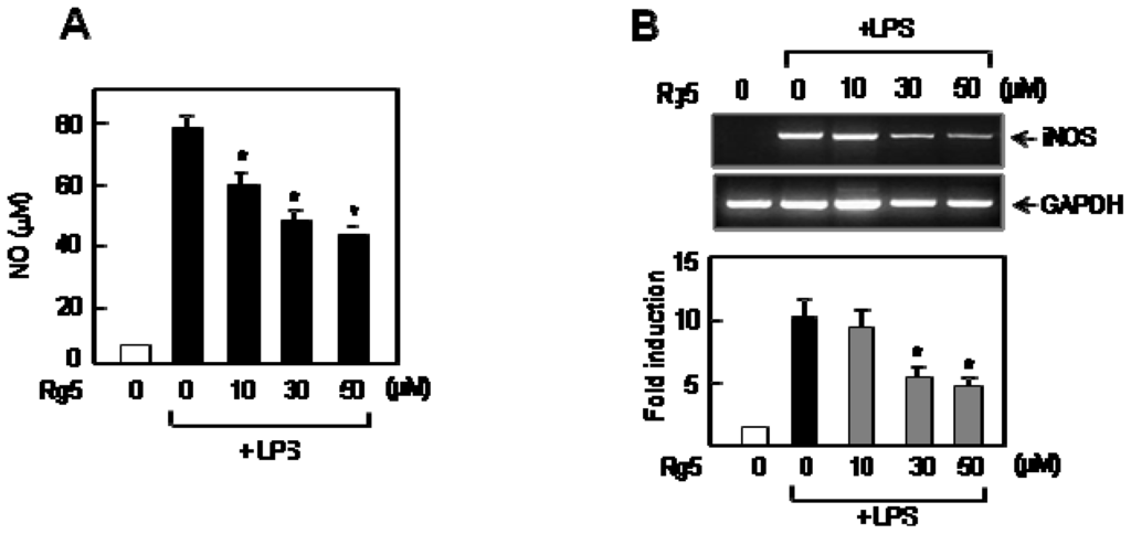 Figure 2. Effect of Rg5 on LPS-induced NO production and iNOS expression in BV2 microglial cells. (A) The cells were pre-treated with the indicated concentration of Rg5 for 1 h, followed by treatment of lipopolysaccharide (LPS) (100 ng/mL) for 16 h. The amounts of NO released into media were measured as described in the method section. The data are expressed as the mean ± SEM. of three independent experiments. *p < 0.05, significantly different from the LPS-treated sample; (B) RT-PCR data for iNOS mRNA expression. The data are representative of at least three independent experiments. Quantification data are shown in the graph (n = 3).