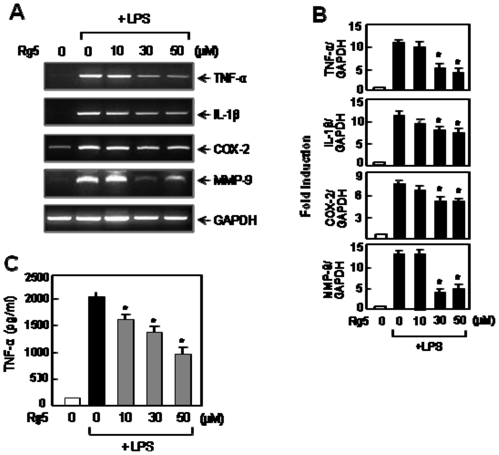 Figure 3. Rg5 suppressed LPS-induced expression of TNF-α, IL-1β, COX-2 and MMP-9 in BV2 cells. (A) The cells were pre-treated with the indicated concentration of Rg5 for 1 h, followed by treatment of LPS (100 ng/mL) for 6 h. Total RNA was isolated from the cells, and RT-PCR was performed to measure the mRNA levels of TNF-α, IL-1β, COX-2 and MMP-9. The data are representative of three independent experiments; (B) Quantification data are shown in the graph (n = 3). *p < 0.05, significantly different from the LPS-treated sample; (C) The BV2 cells were pre-treated with Rg5 A for 1 h, followed by treatment of LPS (100 ng/mL) for 16 h. The amounts of TNF-α released into media were measured by ELISA. The data are expressed as the mean ± SEM. of three independent experiments. *p < 0.05, significantly different from the LPS-treated sample.