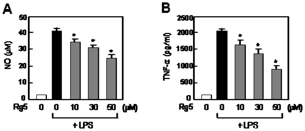 Figure 4. Effect of Rg5 on NO and TNF-α production in LPS-stimulated primary microglial cells. (A) The cells were pre-treated with the indicated concentration of Rg5 for 1 h, followed by treatment of LPS (100 ng/mL) for 16 h. The amounts of NO released into media were measured as described in the method section; (B) The amounts of TNF-α released into media were measured by ELISA. The data are expressed as the mean ± SEM. of three independent experiments. *p < 0.05, significantly different from the LPS-treated sample.