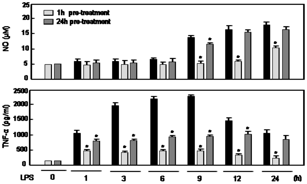 In the above data (Figures 2 and 4), we presented the effects of one hour treatment of Rg5 followed by LPS treatment. To investigate whether pre-treatment of 24 h before the LPS challenge affects the anti-inflammatory effects of Rg5, we compared the effects of 1 h and 24 h pre-treatment of Rg5 on LPS-induced NO and TNF-α production in BV2 cells at various time points. As shown in Figure 5, the 24 h-pre-treated samples showed less anti-inflammatory effects compared with the 1 h-pre-treated group. The attenuation of anti-inflammatory effects of Rg5 in the 24 h pre-treatment group may be explained in the following points of view. First, the target of Rg5 is upstream in the inflammation signaling (e.g., cell surface receptor, NADPH oxidase, etc.). Thus, the effect of Rg5 may be reduced after 24 h, because most of the Rg5 is uptaken by the cells at that time point. Second, Rg5 is known to have binding affinity with BSA in the serum of the media, which may cause reduction in the concentration of free Rg5 that acts on the cells. Furthermore, when we examined the time course effect of Rg5, the ginsenoside significantly inhibited TNF-α and NO production at 1 h and 9 h of LPS treatment, respectively, and the effects persisted at least for 24 h (Figure 5). The data indicate that Rg5 modulates upstream inflammatory signaling and, thus, produces anti-inflammatory effects at early time points.