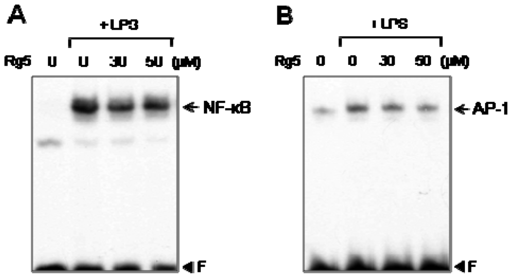Figure 6. Effect of Rg5 on DNA binding activities of NF-κB (A) and AP-1 (B) in LPS-stimulated BV2 cells. Nuclear extracts were prepared from BV2 cells after treatment with LPS (100 ng/mL) for 3 h in the absence or presence of Rg5, and then DNA binding activities were examined by electrophoretic mobility shift assay (EMSA). The data show that Rg5 significantly inhibited LPS-induced DNA binding activities of NF-κB and AP-1. The results are representative of three independent experiments.