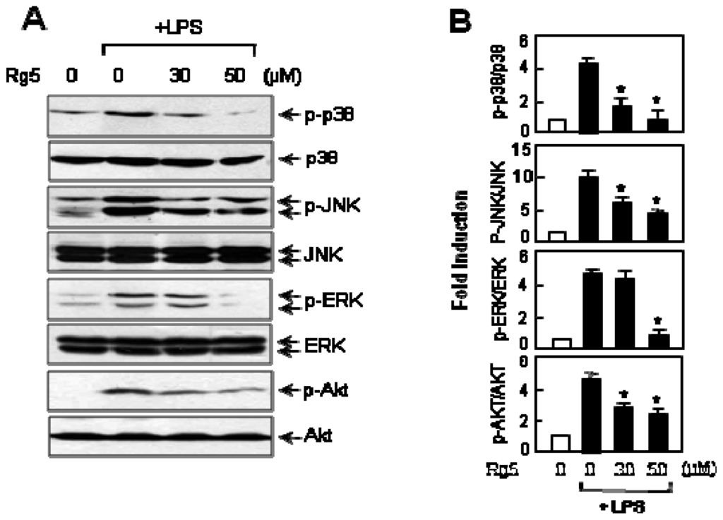 Figure 7. Rg5 inhibits the phosphorylation of three types of MAP kinases and Akt in LPS-stimulated BV2 cells. (A) Cell extracts were prepared from BV2 cells treated with LPS (100 ng/mL) for 3 h with or without Rg5 and were subjected to immunoblot analysis using antibodies against phospho- or a total form of three types of MAP kinases (p38 MAPK, ERK1/2 and JNK) and Akt. The results are representative of three independent experiments; (B) Quantitative analysis of the phosphorylations of three MAPKs and Akt. The data are expressed as the mean ± SEM. of three independent experiments. *p < 0.05, significantly different from the LPS-treated sample.
