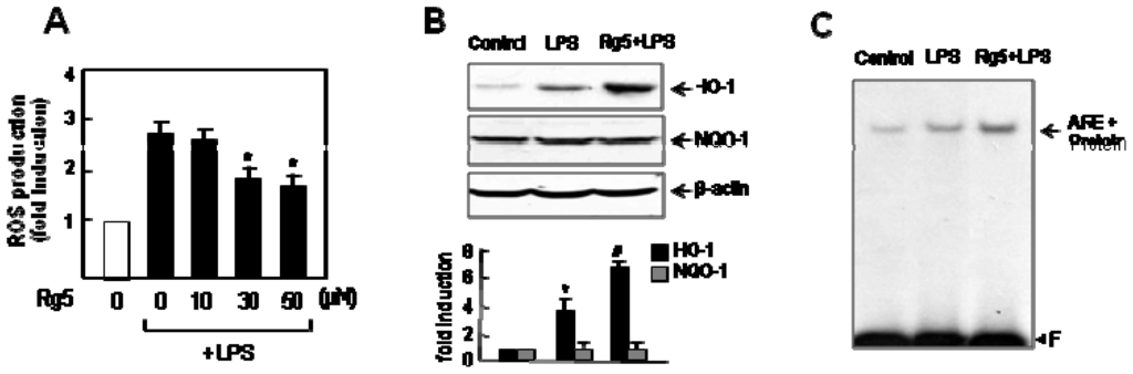 Figure 8. Rg5 inhibited ROS production and increased HO-1 expression via ARE. (A) The BV2 cells were pre-treated with Rg5 for 1 h, followed by treatment with LPS (0.1 μg/mL) for 16 h. The intracellular ROS levels were then measured by the DCF-DA method, as described in the Materials and Methods section. The data are expressed as the mean ± SEM. of three independent experiments. *p < 0.05, significantly different from LPS-treated sample; (B) Western blot analysis shows the effect of Rg5 (50 μM) on HO-1 and NQO1 protein expressions. The BV2 cells were treated with LPS for 24 h in the absence or presence or of Rg5, and cell lysates were obtained. Quantification data are shown in the graph (n = 3). The data are expressed as the mean ± SEM. of three independent experiments. *p < 0.05, significantly different from the control sample. #p < 0.05, significantly different from the LPS treated sample; (C) EMSA for nuclear protein binding to the ARE element. The arrow indicates a DNA-protein complex of ARE. The data are representative of three independent experiments.