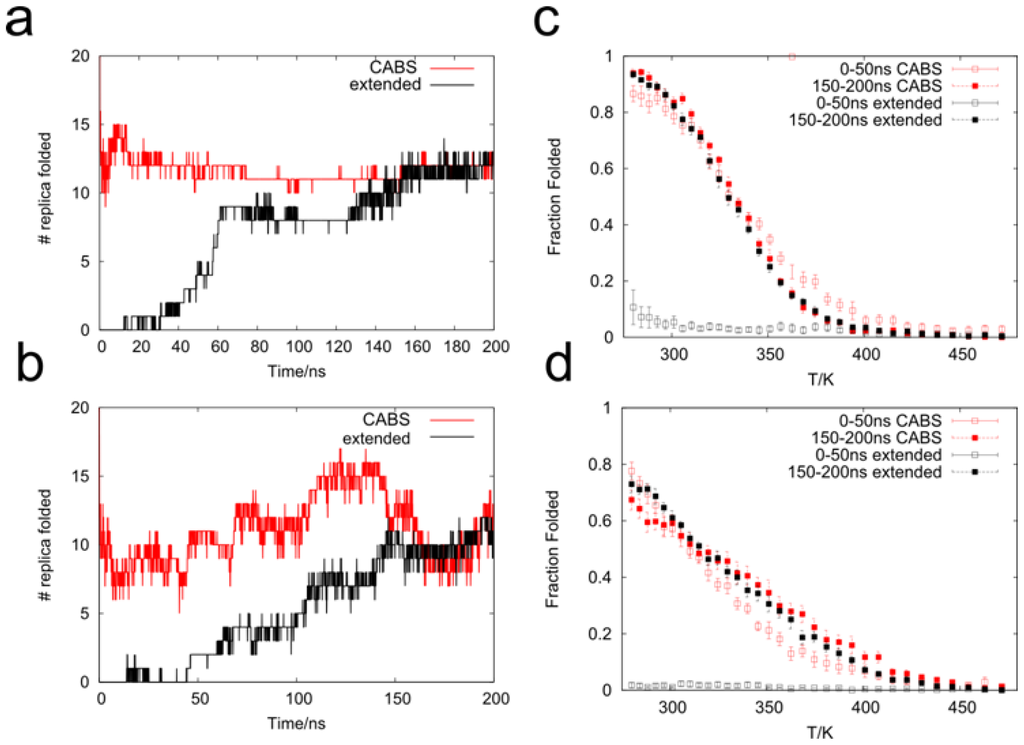 Number of folded replicas as a function of time [(a) OPLSAA force field; (b) Amber99sb force field.] and fraction of native-like conformations at corresponding temperatures [(c) OPLSAA force field; (d) Amber99sb force field] for two starting options: extended conformations (black) and CABS-generated conformations (red). Data from various time ranges were applied to indicate the time essential for reaching the equilibration state.