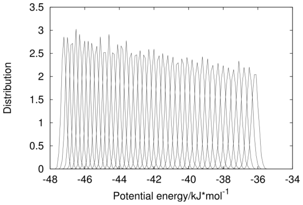 Potential energy distribution for each temperature replica divided by the number of particles in the system for the OPLSAA force field with CABS-generated starting conformations.