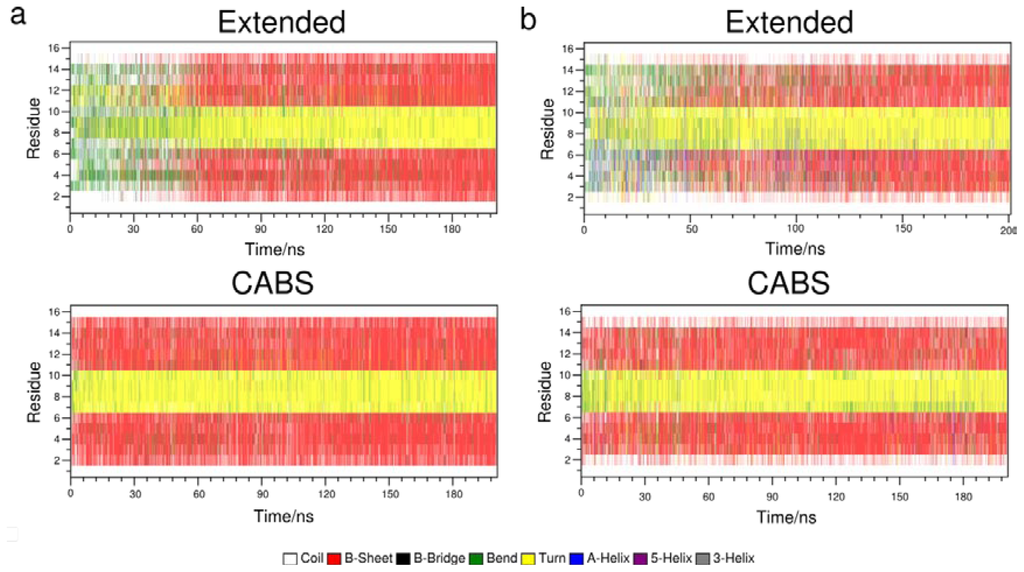 Plot of a secondary structure formed on every residue of the β-hairpin for two starting options: Extended conformations (upper panel) and CABS-generated conformations (lower panel) at 300 K. (a) Diagrams for the OPLSAA force field; (b) Diagrams for the Amber99sb force field.