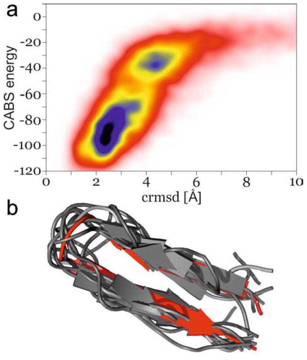 (a) Conformation density map as a function of CABS energy vs. C-alpha Root Mean Square Deviation (CRMSD); (b) Example rebuilt conformations, extracted from the CABS trajectory. These models are selected so as to preserve a similar CRMSD to the native C-terminal β-hairpin of the 2GB1 protein, which is colored red.