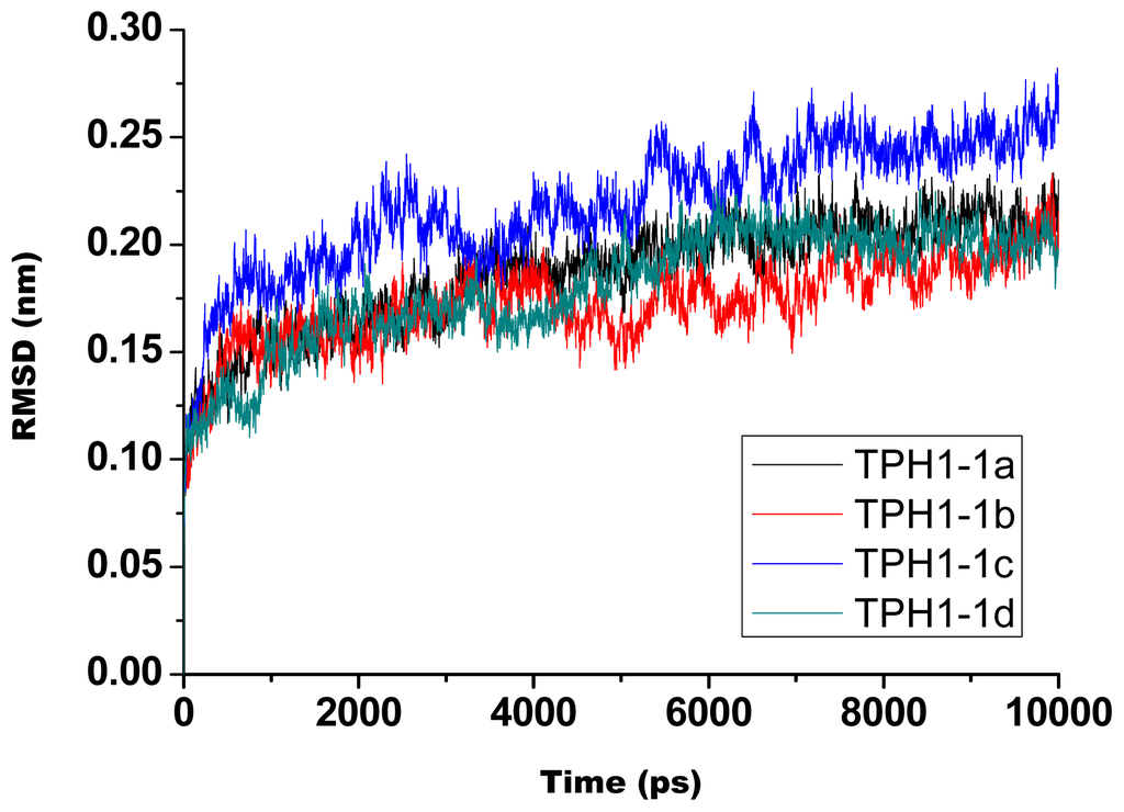 In this study, the MD simulations of four TPH1–inhibitor complexes (showed in Figure 1) were successfully run for 10 ns scale. To evaluate the reliable stability of the MD trajectories and the difference of the stabilities in the MD simulations, there were calculated the RMSD values of the TPH1 backbone atoms relative to the initial minimized structure through the phase of the simulation (plotted in Figure 2). One can see that the 1a- and 1d-TPH1 complexes reached equilibrium after 5 ns of the simulation phase, while the 1b- and 1c-TPH1 complexes were not stable until about 7 ns. According to Figure 2, the RMSD values of the 1a-, 1b-, 1c- and 1d-TPH1 complexes were 0.17, 0.16, 0.19 and 0.23 nm, respectively, with a deviation lower than 0.05 nm; among these structures, the 1a-TPH1 complex had the most reliable stability. These results showed that the trajectories of the MD simulations for the four complexes were stable after 7 ns, so it was reasonable to do the binding free energy calculation and free energy decomposition based on the snapshots extracted from 7 to 10 ns.