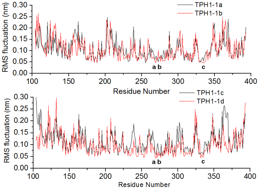 More detailed analysis of root-mean-square fluctuation (RMSF) versus the protein residue number for the four complexes is illustrated in Figure 3. In this figure, it is observed that the four inhibitor/protein complexes possess the similar RMSF distributions, indicating that these inhibitors could have the similar interaction mode with TPH1 on the whole. Moreover, the active site regions (such as Asp269, His272, Ser336, etc.) show a rigid behavior for all complexes.