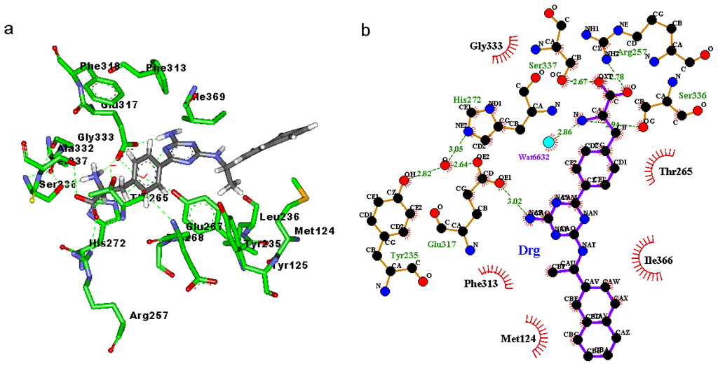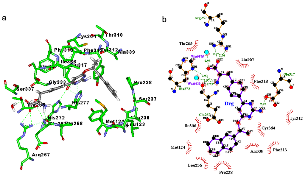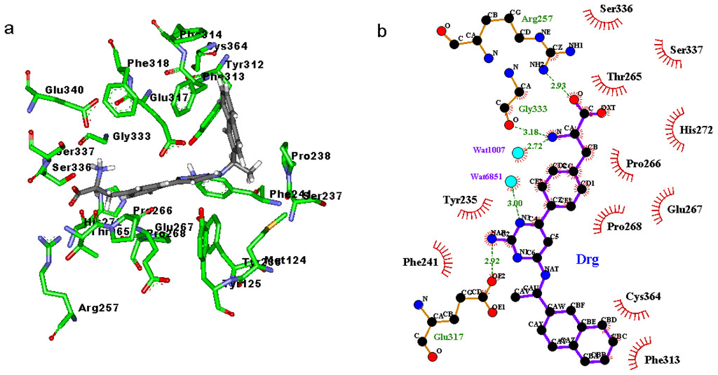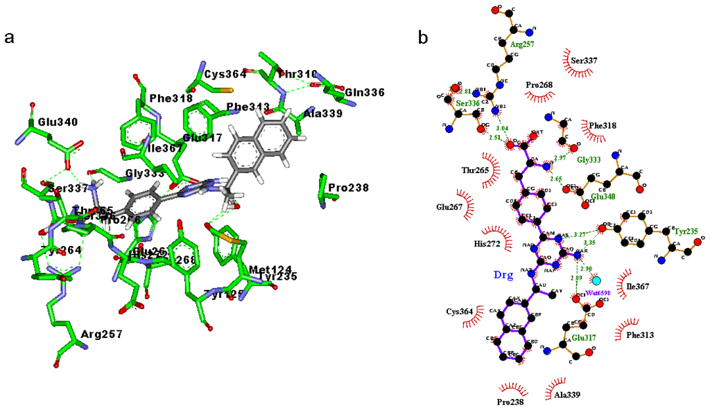 Binding modes for the active site of TPH1 with inhibitors 1a to 1d are displayed in Figures 4 and 7. From Figures 4, 5, 6, 7a it can be observed that inhibitors extend deeply into the binding site of TPH1. The analysis of the intermolecular interactions including hydrophobic and hydrogen-bonding contacts on the TPH1–inhibitor complexes is carried out using Ligplot plus [20,21], as shown in Figures 4, 5, 6, 7b. The phenylalanine fragment could bind in a deep active site, formed by the hinge region residues (Arg257, Thr265, Glu267, His272, Glu333, Ser336 and Ser337) via two to five hydrogen bonds. The N atoms of the amino group could form hydrogen bonds with the backbone atoms of Gly333, Glu267 or side chain O atom of Ser336; the O and OXT atoms of the carboxyl group in the phenylalanine fragment could form hydrogen bonds with the side chain atoms of Arg257, Ser336 and Ser337, respectively. The 2-amino group of the pyrimidine or triazin ring could also form hydrogen bonds with the side chain atoms of Glu317 and Tyr235. Additionally, the oxygen atoms of the solvent water molecules could form other hydrogen bonds with the N atoms of inhibitors and backbone or side chains of the active site residues. These hydrogen bonds may help to stabilize the interaction between TPH1 and inhibitors. Moreover, the naphthalene ring could interact with a hydrophobic binding pocket, characterized by residues Met124, Leu236, Pro238, Phe313 and Ala339.