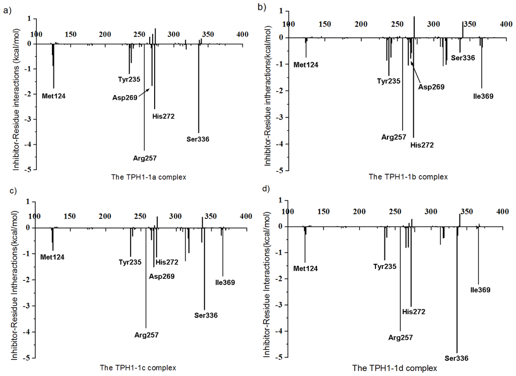 For the purpose of obtaining the detailed presentation of the inhibitor/TPH1 interactions, free energy decomposition analysis was employed to decompose the total binding free energies into inhibitor–residue pairs. The quantitative information of each residue’s contribution is extremely useful to interpret the binding modes of inhibitors with TPH1. The interactions between the inhibitors and each residue of TPH1 are plotted in Figure 8. In Figure 8, the four inhibitors have the similar interaction patterns, which mean stronger interactions with residue Met124, Tyr125, Tyr235, Pro238, Arg257, Glu267, Asp269, Thr370, Cys271, His272, Glu317, Gly333, Ser336 and Ile369 of TPH1. It is notable that Arg257, His272, Ser336 and Ile369 are the key residues for the distinction in all inhibitors.