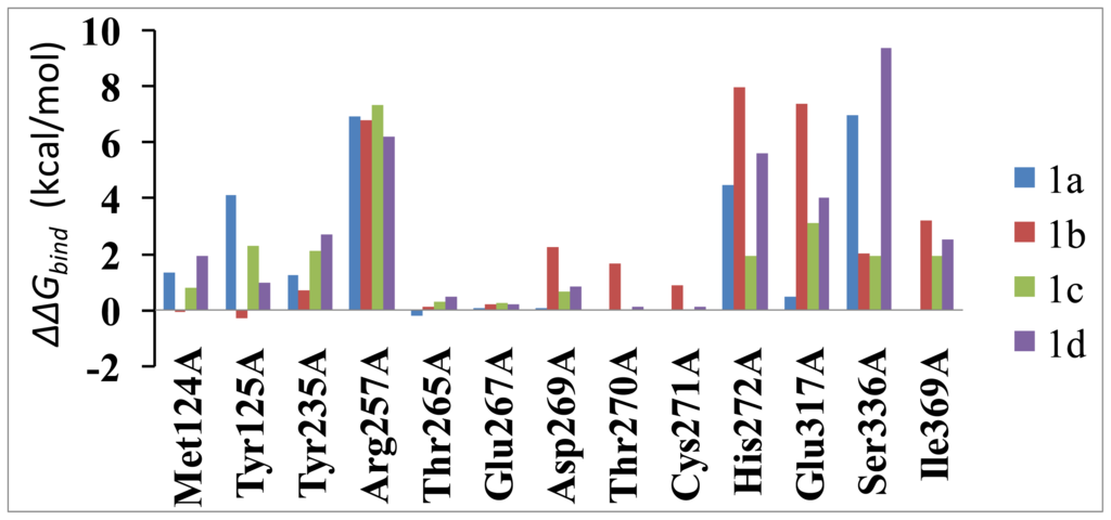 To investigate other factors besides inter-molecular interactions that may help confer specificity, computational alanine scanning was employed to probe which residues make a significant intermolecular contribution to the differential in binding. This method depends on the assumption that local changes of the protein do not influence the whole conformation of the complex significantly. The thirteen key residues covering the walls of the pocket are mutated as shown in Figure 9 and the results of the mutagenesis are presented. Data are also depicted as a graph in Figure 9. It must be noted that computational mutagenesis was done with the single-trajectory method. This means that the simulation trajectory of the wild-type TPH1 complex was used to generate the structures of the mutated TPH1–inhibitor complexes. Positive energetic changes (ΔΔGbind= ΔGmut − ΔGwt) represent an unfavorable interaction. As expected, we see that in general, mutations of active site residues are highly unfavorable with all four inhibitors. Figure 9 displays the changes of the inhibitor–residue interaction caused by the alanine scanning. The alanine scanning results in the reduction of the inhibitor–residue interaction energy for the selected residues. The inhibitor–residue interaction energies of six common residues have a decrease of higher 1.0 kcal·mol−1, and these residues include Tyr235, Arg257, His272, Glu317, Ser336 and Ile369. This result shows these six residues located in the hot spot of the surface between the inhibitor and TPH1. In addition, the decreases in the interaction energy of Tyr125 with inhibitor 1a is higher than 4.0 kcal mol−1, and the decreases in the interaction energy of Asp269, Thr270 and Cys271 with inhibitor 1b is higher than 1.0 kcal mol−1; the above results basically agree with the previous analyses.