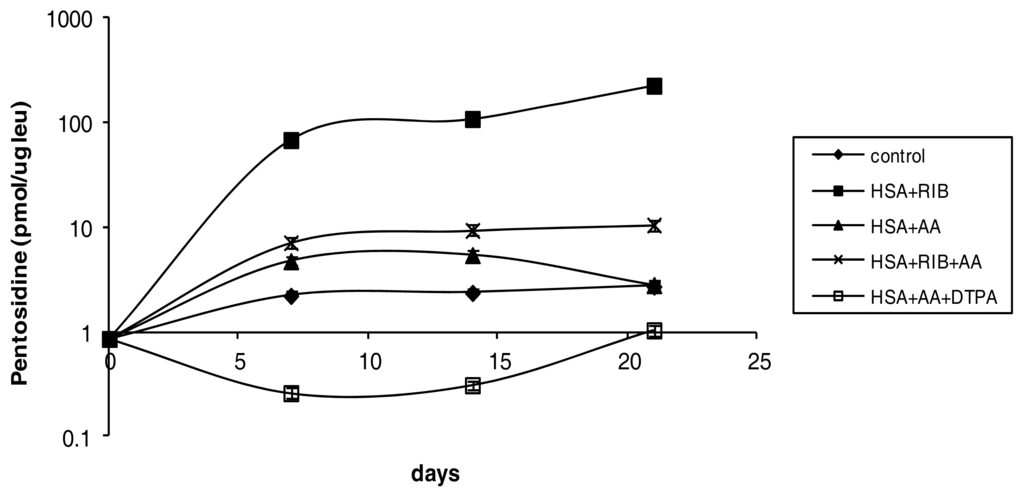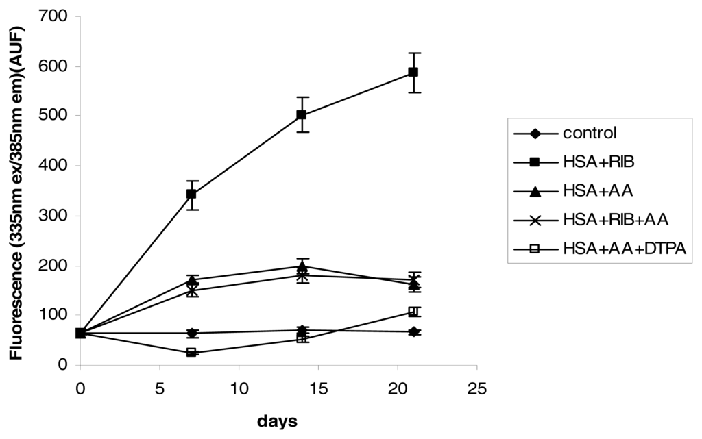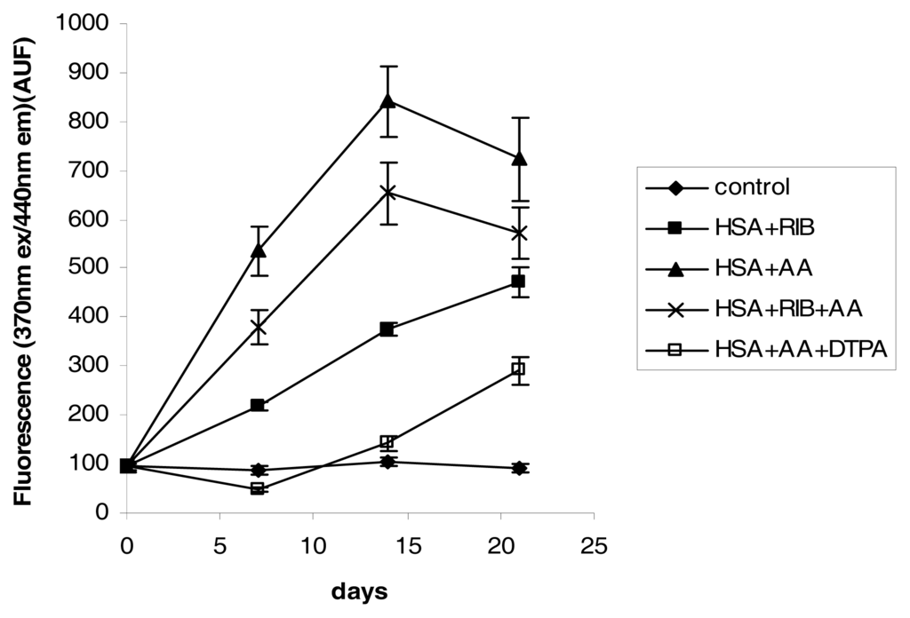 The purpose of this study was to establish an in vitro model system to incubate HSA with ribose, a strong inducer of glycoxidation []. We also attempted to modulate the process of glycation through coincubation with other substances, including AA as an antioxidant [] and diethylenetriamine pentacetate (DTPA) as a metal chelator.