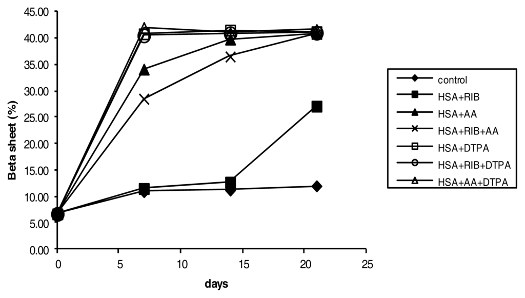 The CD analysis indicated that ribose was a relatively weak and slow modifier of secondary protein structure. Ribose induced a significant reduction in the proportion of the alpha-helical structure of HSA (Figure 9), with a parallel increase in beta-sheet structures (Figure 10), but only after 21 days of incubation, compared to the respective controls. AA, ribose + AA, ribose + DTPA and AA + DTPA were strong modifiers of secondary protein structure (Figures 9 and 10). After 7 days of incubation, a significant decrease in the alpha-helix conformation was already evident (p < 0.05 for each incubation compared to the respective controls).